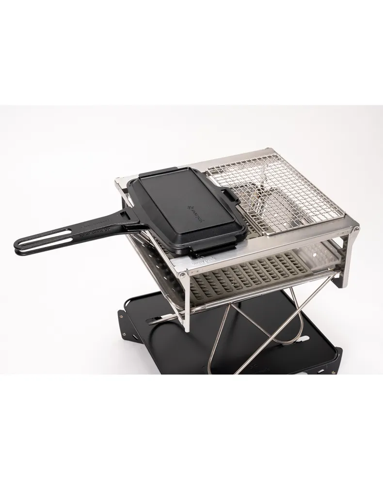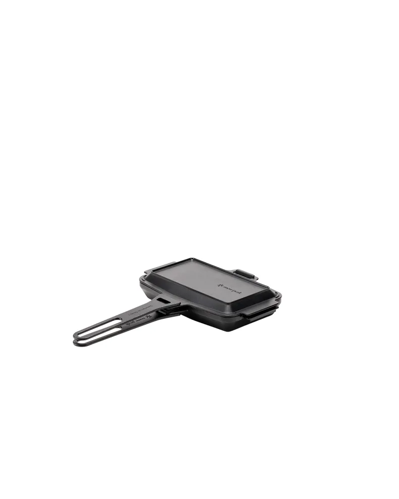 The Cast Iron Sandwich Skillet is a versatile cast iron cooking tool. The skillet features two sides that can be locked together to create a sandwich press or separated and used individually. Each side includes a removable handle, which can be used in a variety of ways, either independently or together.
