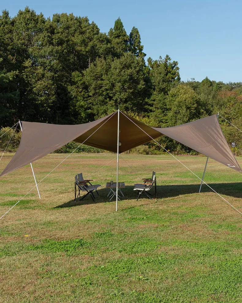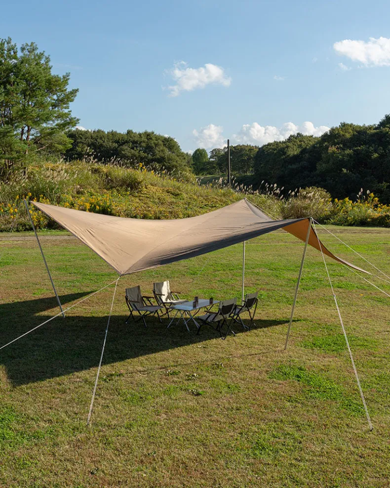 TheHD Para Tarp is a three-pole tarp with a new innovative design. The tarp features an elevated front for easy entry,while the center section is optimal for seated gatherings. The structure of the tarp funnels rainwater toward the outer corners, protecting campers from the elements. TheHD Para Tarp is comprised of waterproof fabric that also provides UV protection. Pair the tarp with the for a protected gathering experience.