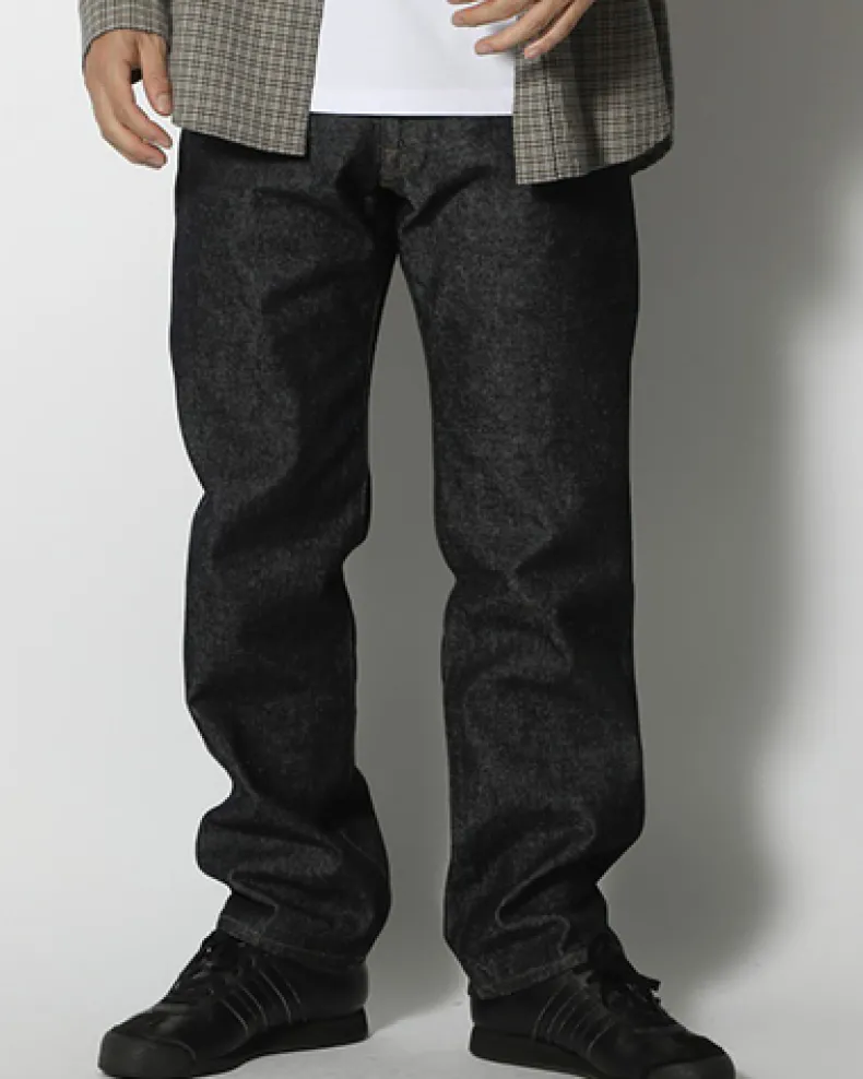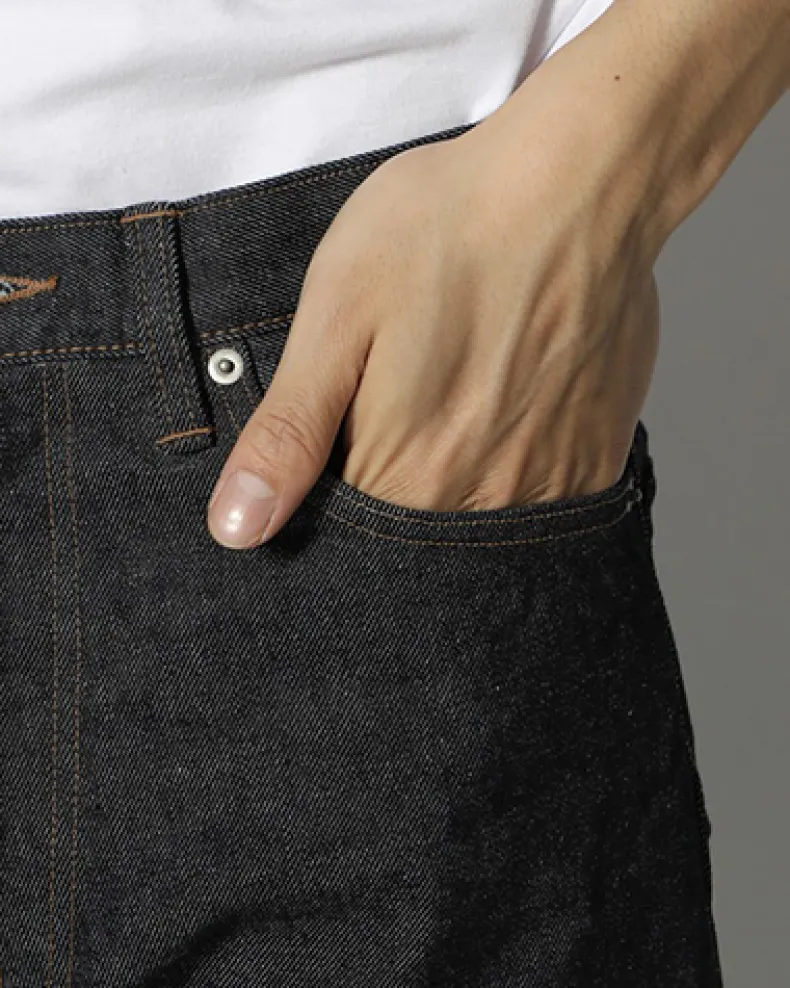 The Recycled Cotton 5pkt Denim Regular is a 12.6oz selvedge denim pant. The fabric is 100% recycled denim, with yarn sourced from Guatemala and woven in Japan. The denim features a button closure, zip fly, five pockets, and a straight leg opening.