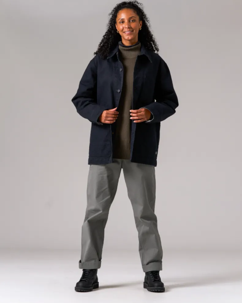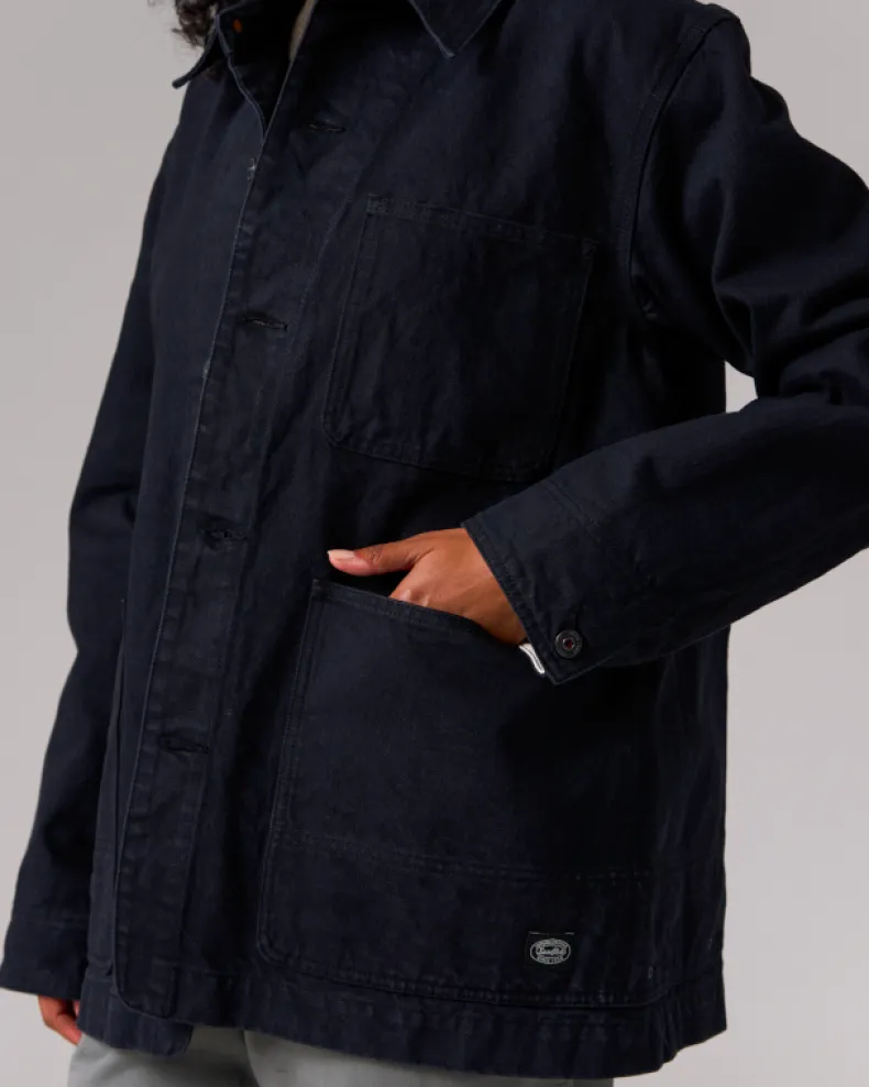 The Recycled Cotton Denim Jacket is a heavy-weight denim chore coat. The jacket features a folded collar, button front, pocket with a pen holder on the left breast, buttoned size adjusters on the back, and dual wraparound pockets at the waist on each side. The material is a 12.6oz recycled denim with reinforced stitching.