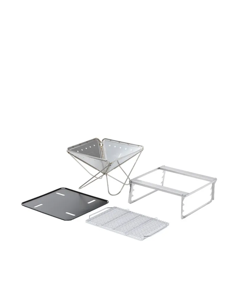 The Takibi Fire and Grill is made of durable stainless steel and designed in Japan for a lifetime of use. Packable, portable, and modular, use the Takibi Fire and Grill to create a gathering anywhere. To cook with charcoal, add on the . The Takibi Fire and Grill is the heart of an expansive product collection, including Snow Peak’s FR & , , and .