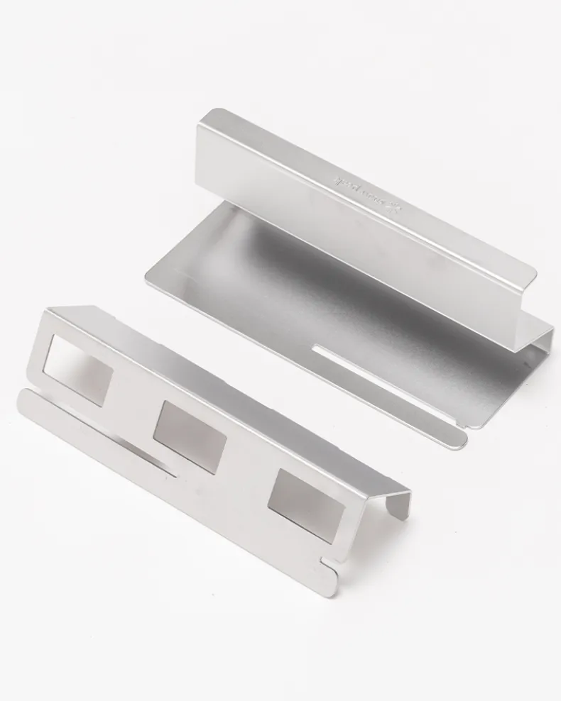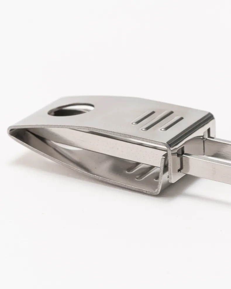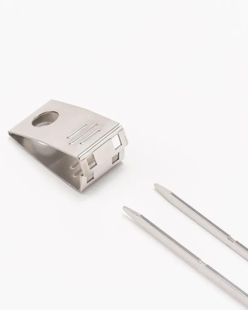 The Takibi Hearth Skewer Set includes two skewers and one skewer stand, designed to expand the capacity of the Takibi Hearth. Each skewer features two prongs, a removable tip cover, and a base that can be easily inserted and removed from the skewer stand.