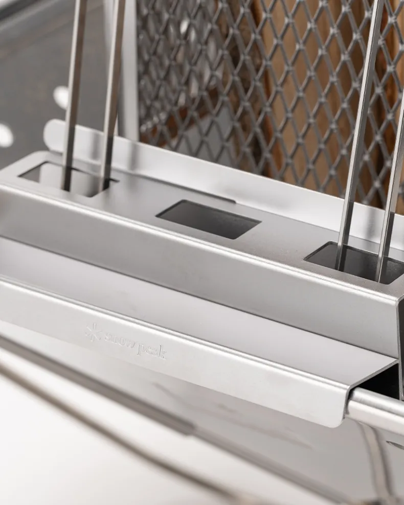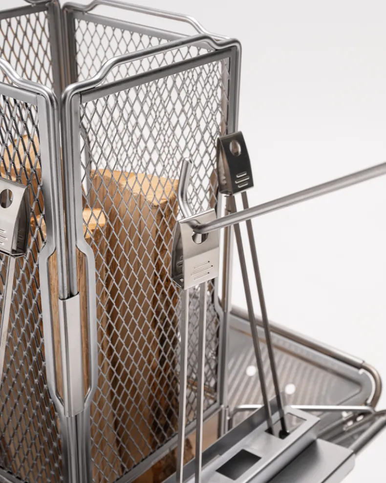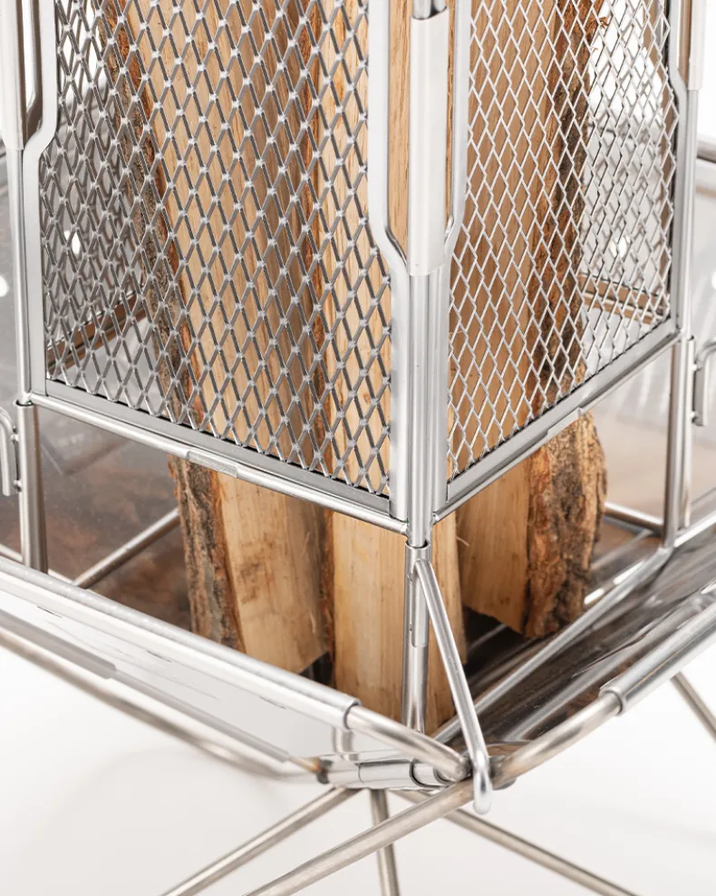 The Takibi Hearth Starter Set is a vertically oriented grilling solution designed to be used with the Pack & Carry L Fireplace and Takibi Fire & Grill. The Takibi Hearth can be used in place of the original Grill Bridge, offering four sides, each with space for two skewers. Wood or coals are placed in the central chamber creating a refined and controlled grilling experience. When not in use, the Hearth folds flat and the skewers and stands come apart for easy cleaning and storage.