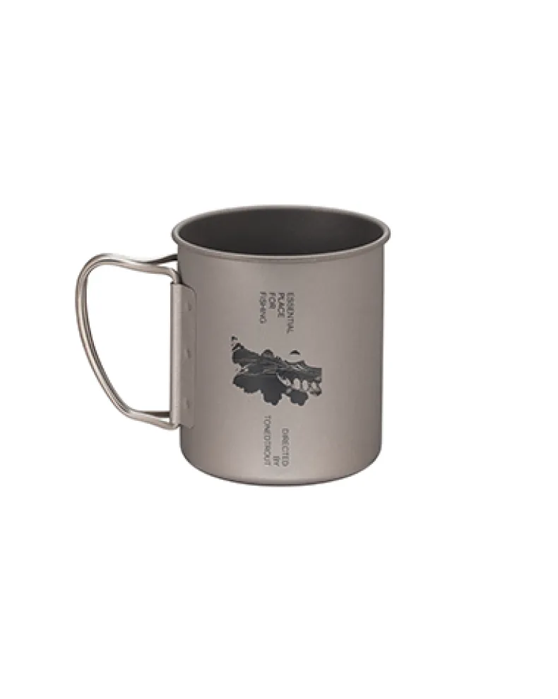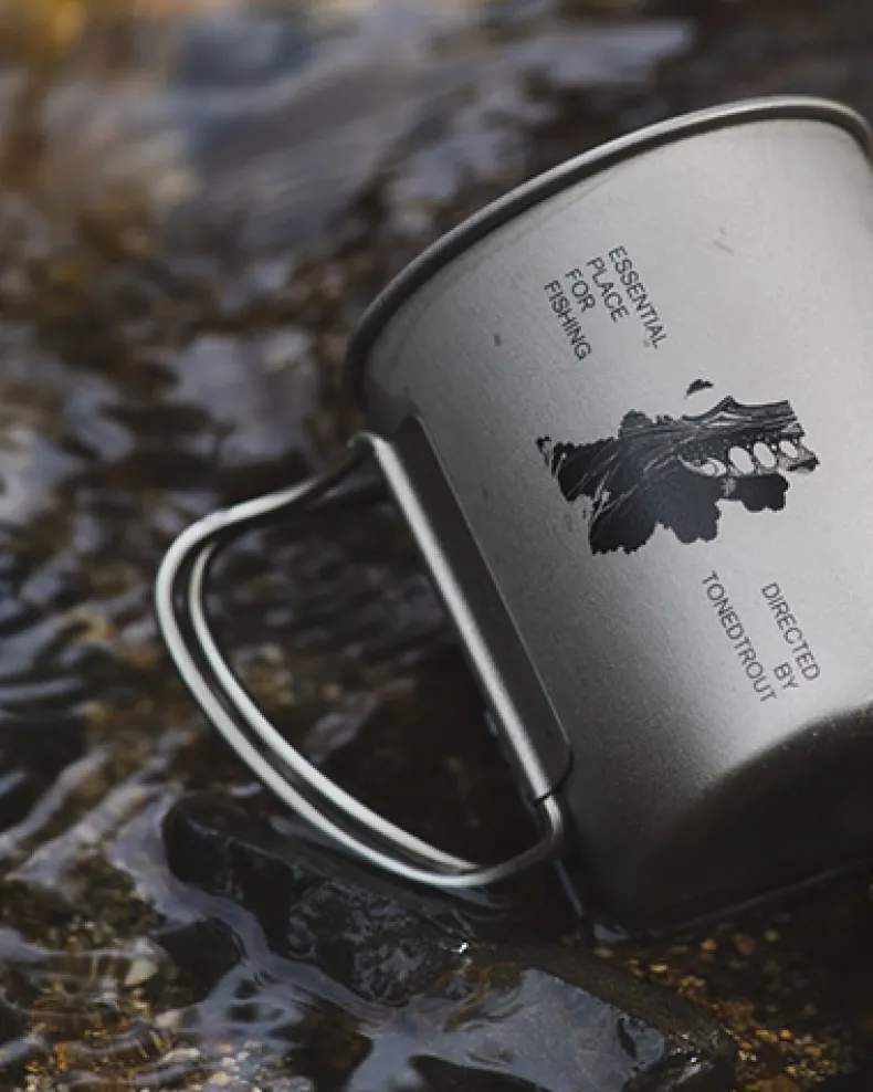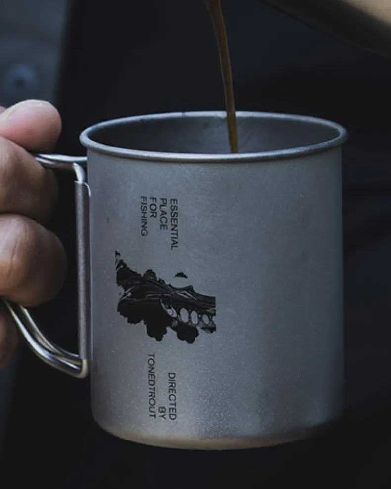 The Toned Trout Ti-Single 300 Cup is a limited-edition item. The cup is made of ultralight Japanese titanium. Designed for everyday use and backcountry excursions, it can be placed directly over a heat source for cooking or warming. The mug features foldable handles for compact storage and is built to last.