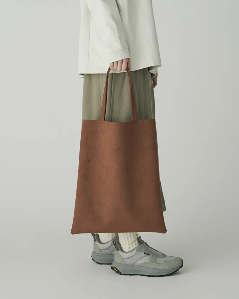 The Vegan Leather Tote Bag is a durable, outdoor shoulder bag that can be used daily or when camping. The bag features handles, a slim profile, and an embossed Snow Peak logo. The material has a soft, suede-like feel, and is made partially from recycled and plant-based polyester. The material is washable, light-resistant and heat-resistant, making it ideal for outdoor activities.