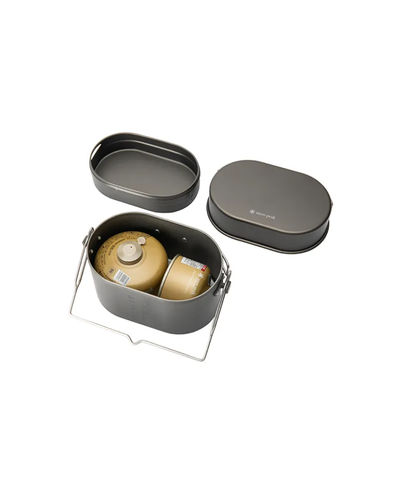 The cook set is large enough to store fuel canisters, a small stove, and utensils for a compact kitchen kit.