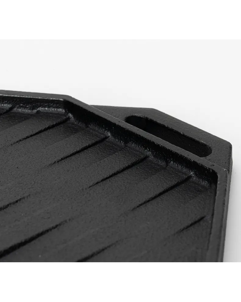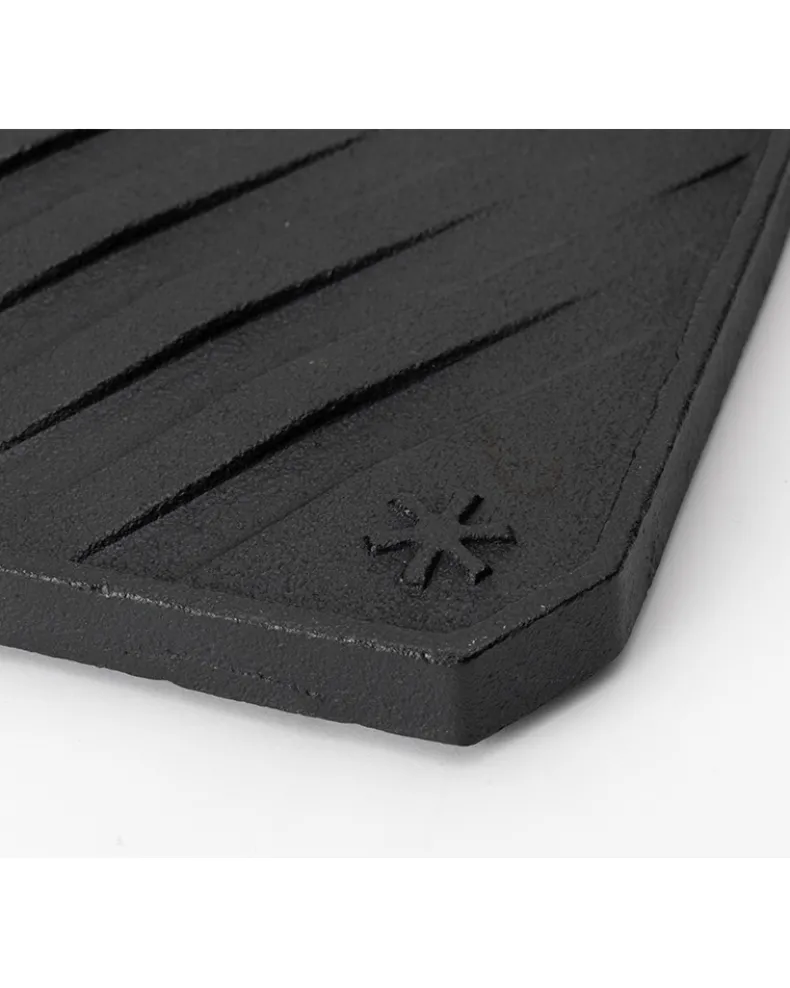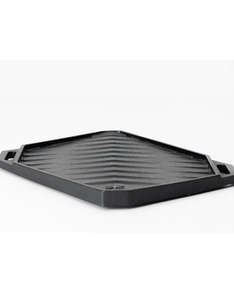 The Giga Power Stove Recta Griddle is a cast iron griddle designed to be used with the Giga Power Stove Recta. The griddle features high ridges for searing meat and vegetables, a raised edge to contain liquids, and and handle slot on both sides for easily moving the griddle while at high temperatures. A removable handle and storage bag for both components are also included.