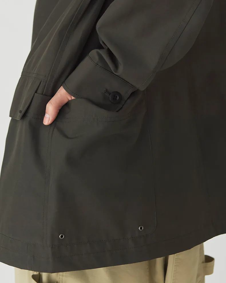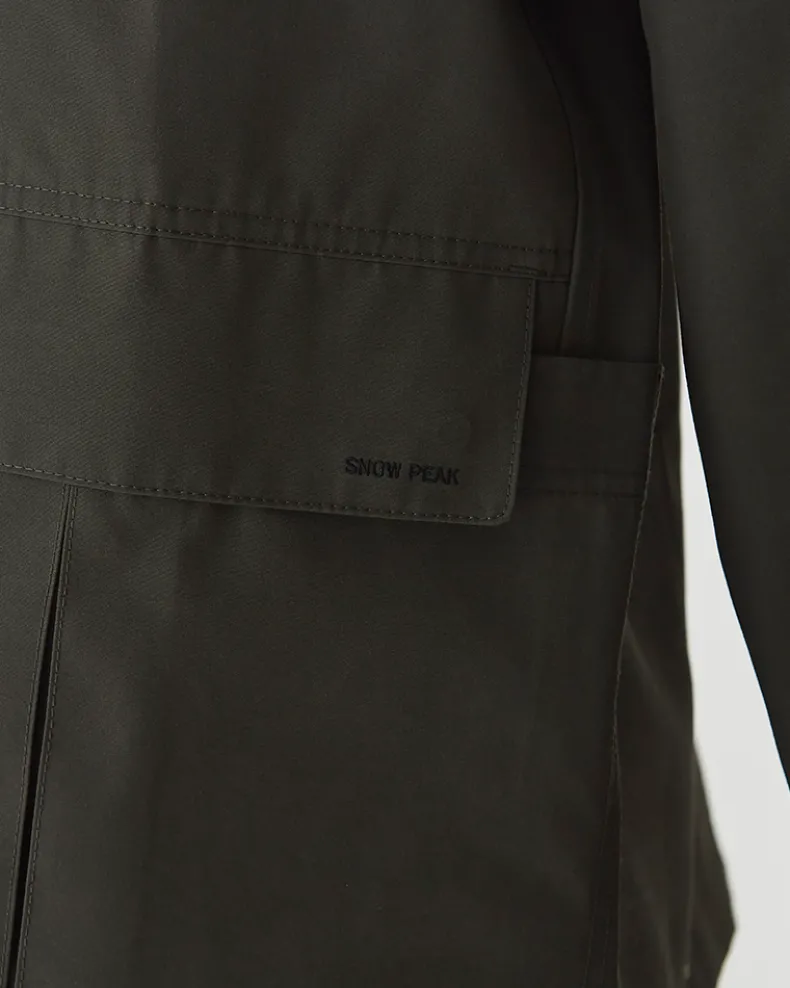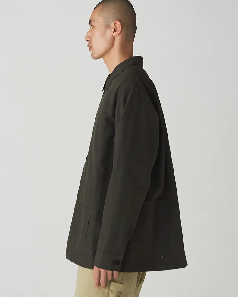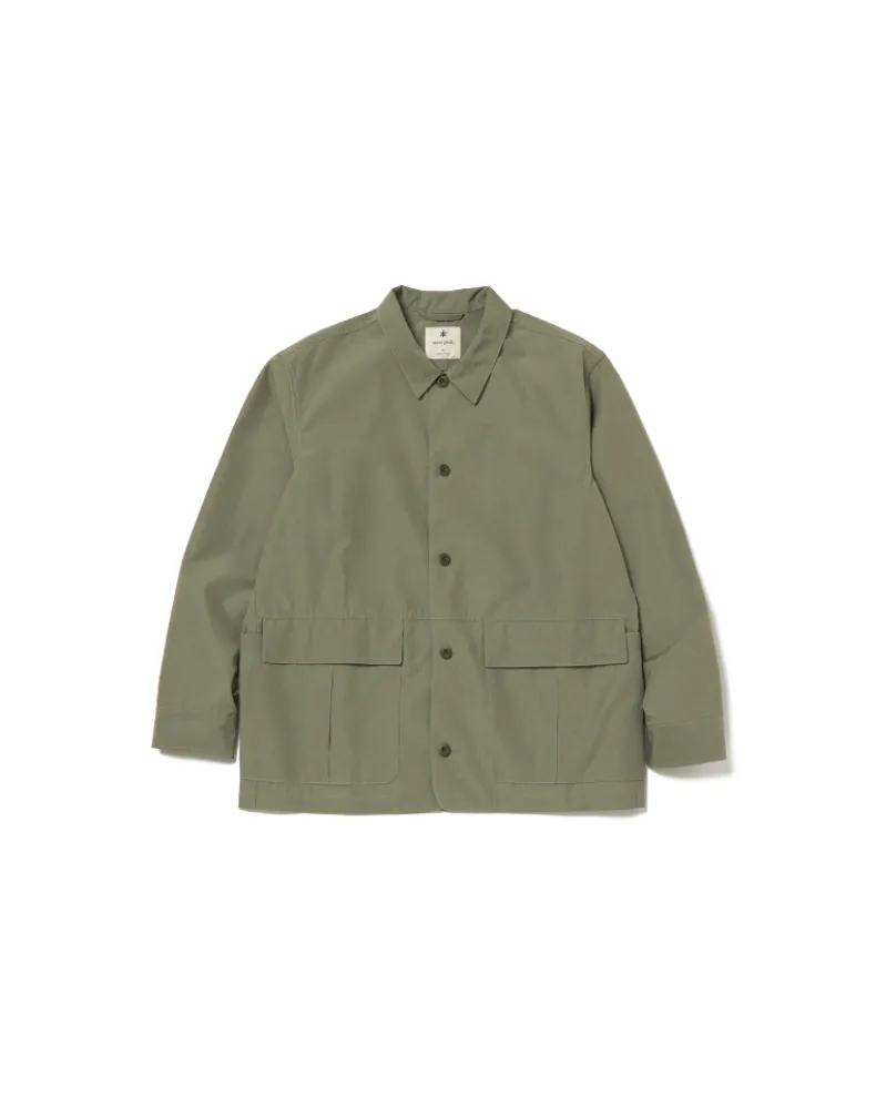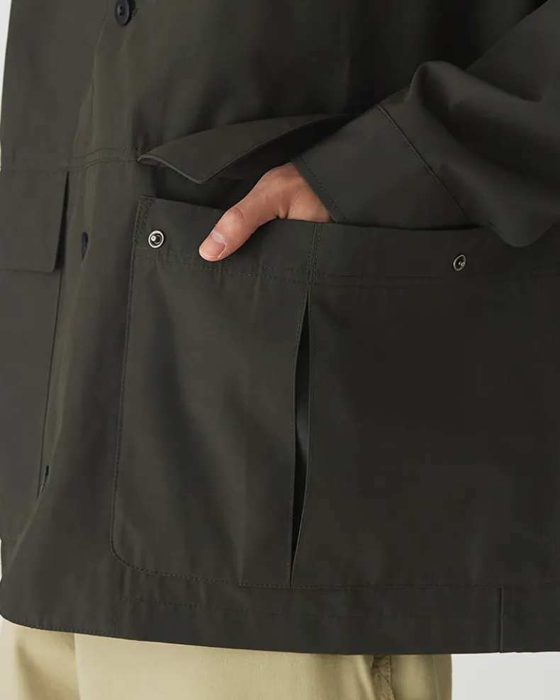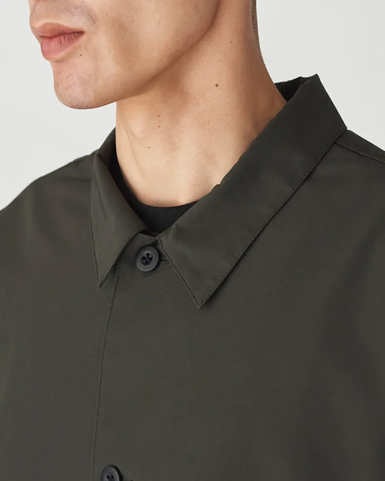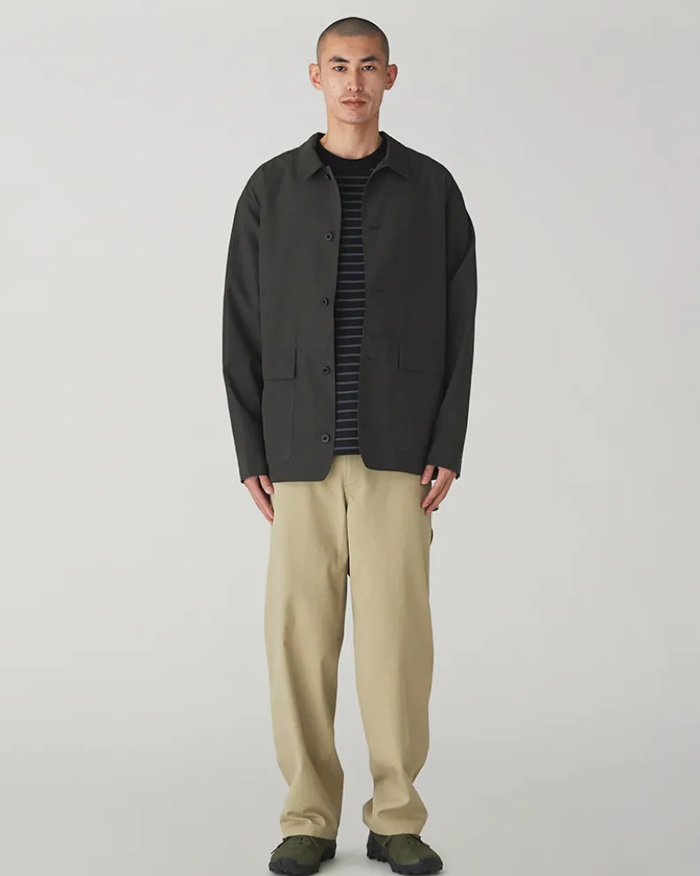 The Pe/Co Weather Jacket is a collared utility jacket. Made from a blend of recycled polyester and cotton, the jacket is lightweight, durable, and resistant to water-based stains. The jacket features two flap pockets at the front, a ventilated patch pocket on either side, a five-button closure, and a folded collar.