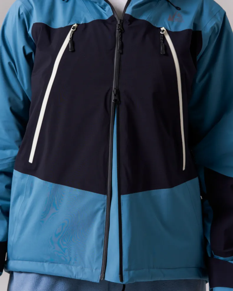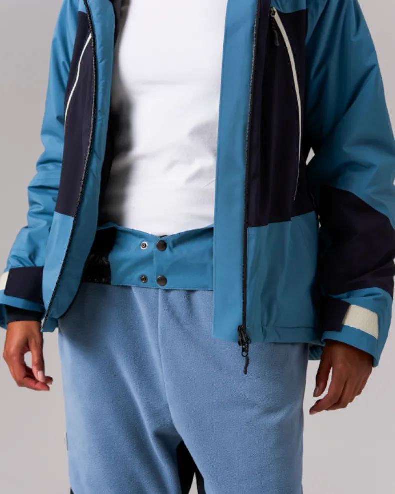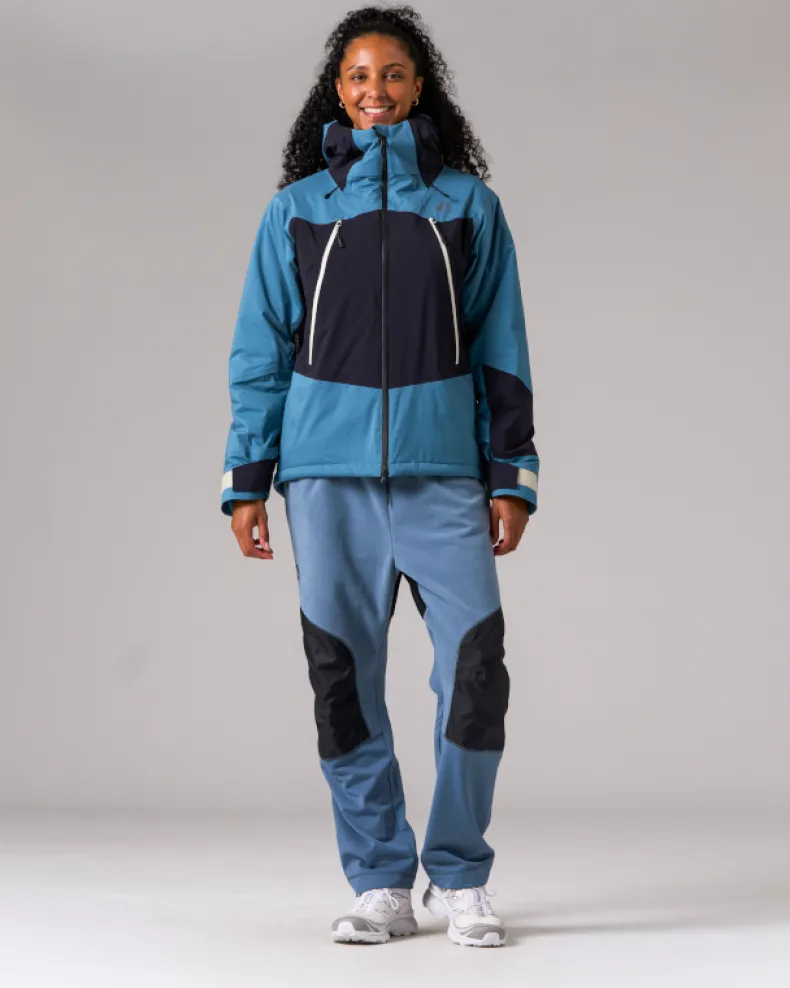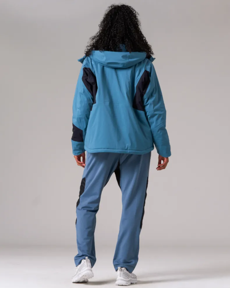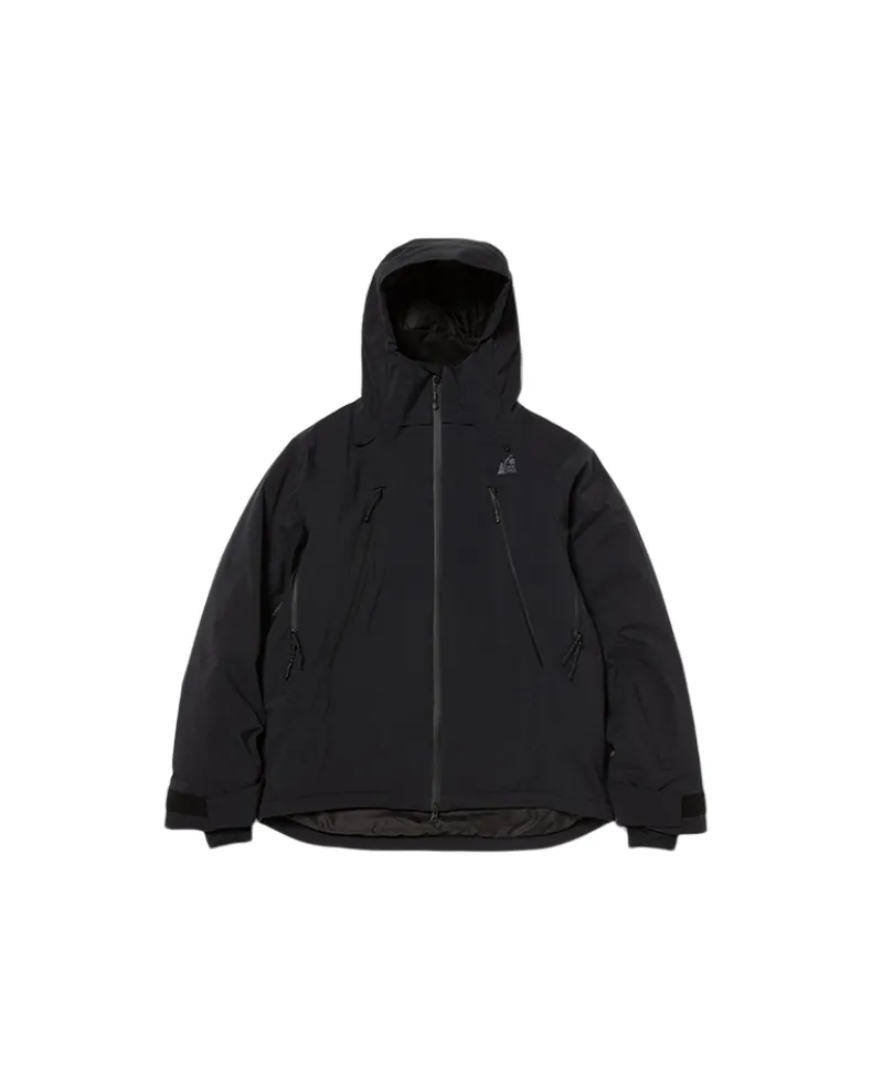 The Snow Padded Jacket is an insulated and waterproof jacket made of durable polyester. It features a hood, dual chest pockets, dual side pockets, and elastic cuffs with hook and loop closure. Designed for skiing and snowboarding, additional details include powder guards on the cuffs and waist, zippered vents under the arms, a double zip at the front, and a two-way adjustable hood for a precision fit when using a helmet.