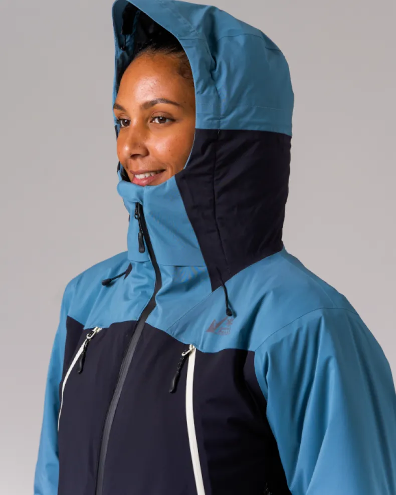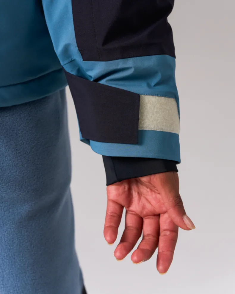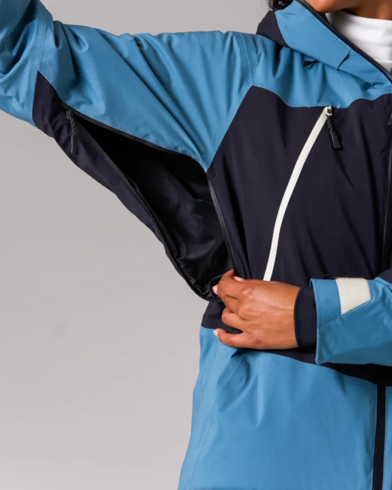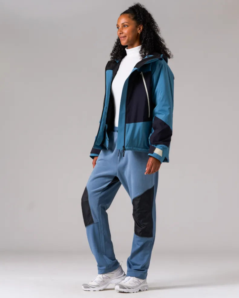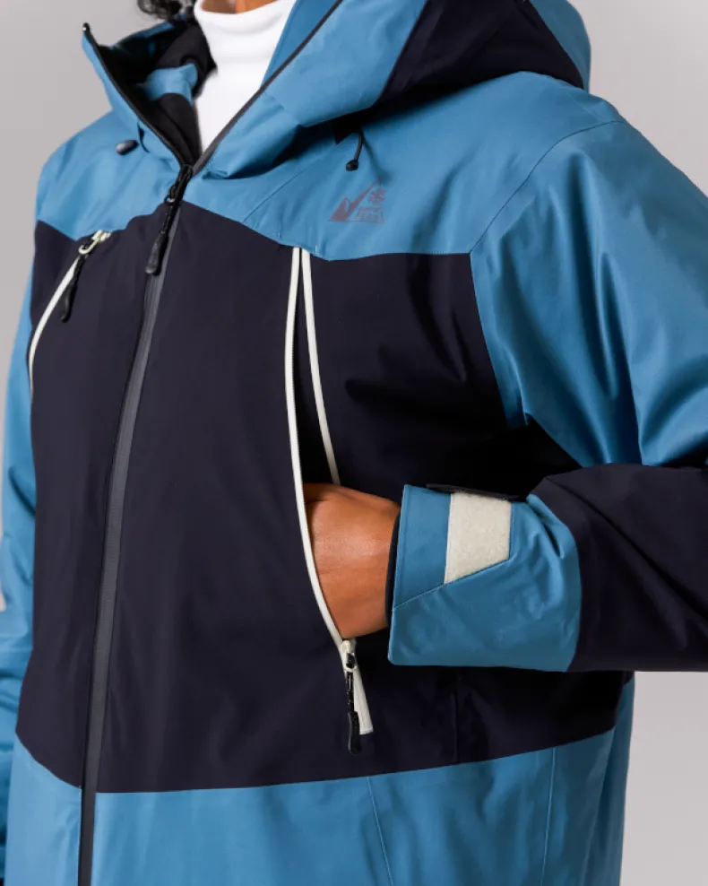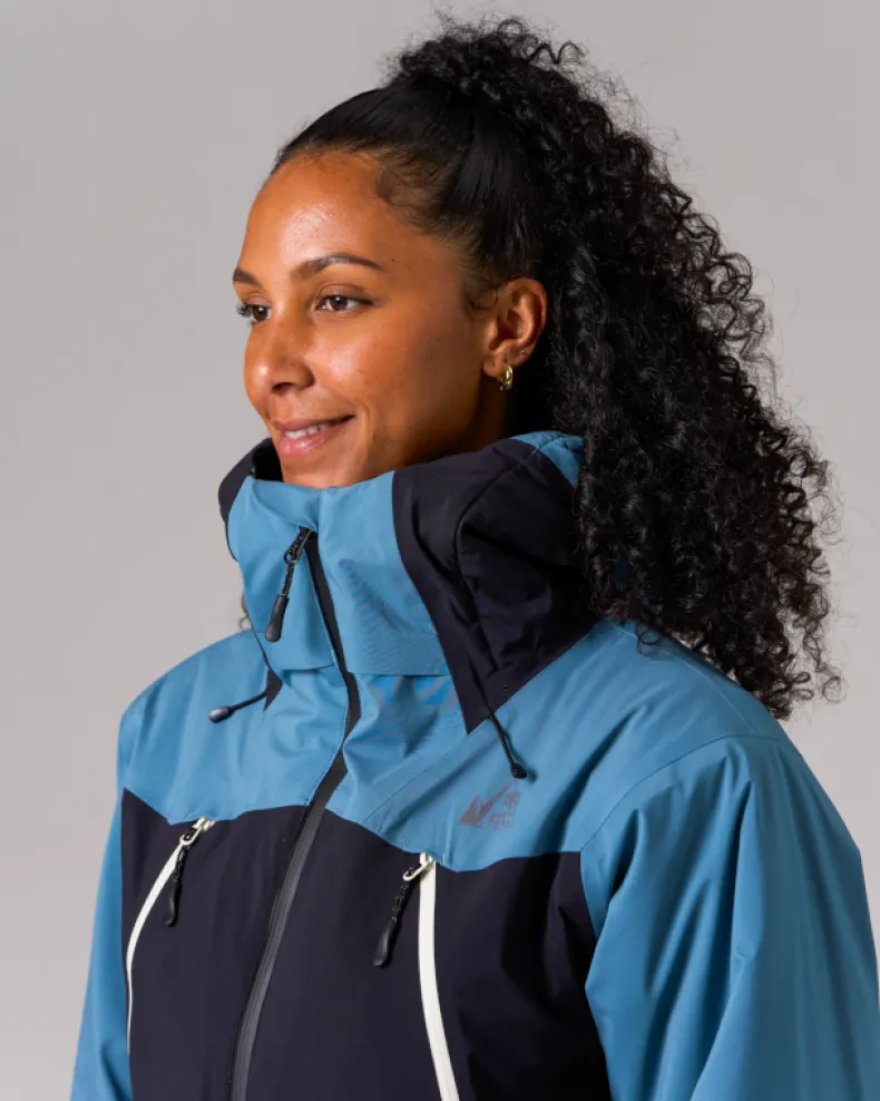 The Snow Padded Jacket is an insulated and waterproof jacket made of durable polyester. It features a hood, dual chest pockets, dual side pockets, and elastic cuffs with hook and loop closure. Designed for skiing and snowboarding, additional details include powder guards on the cuffs and waist, zippered vents under the arms, a double zip at the front, and a two-way adjustable hood for a precision fit when using a helmet.