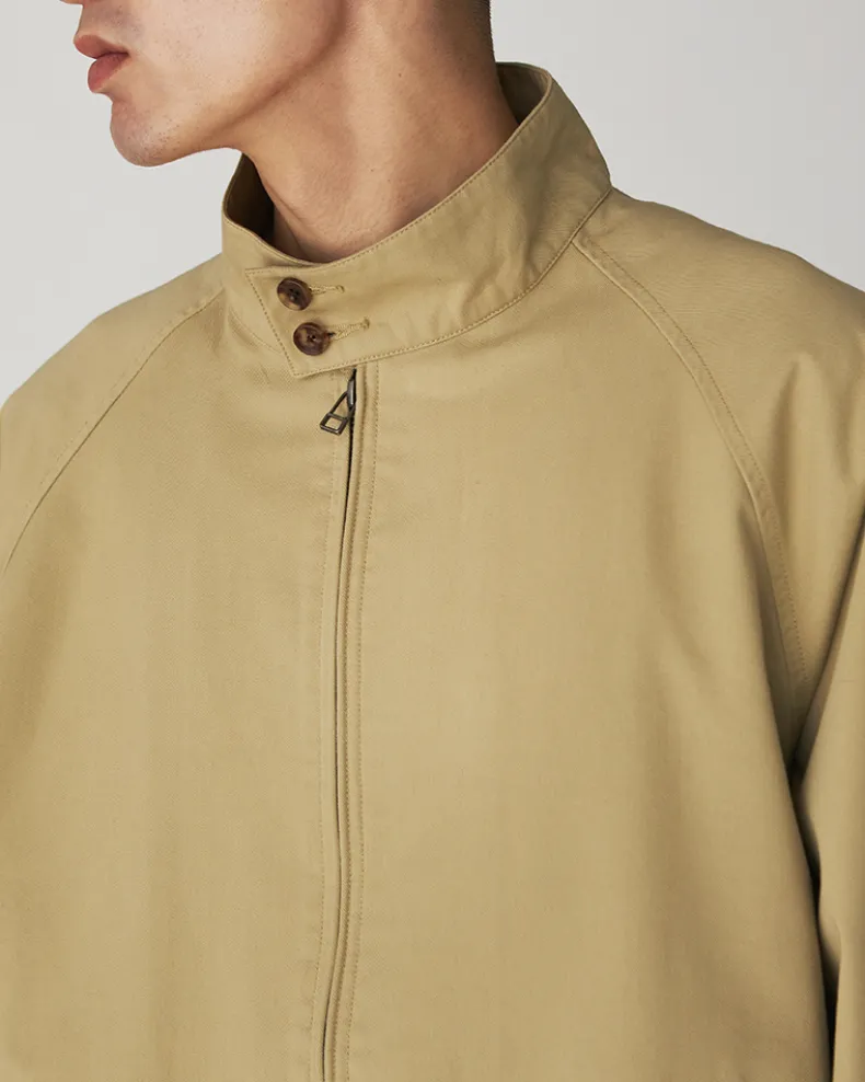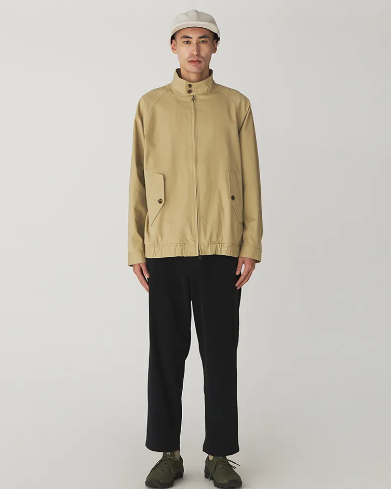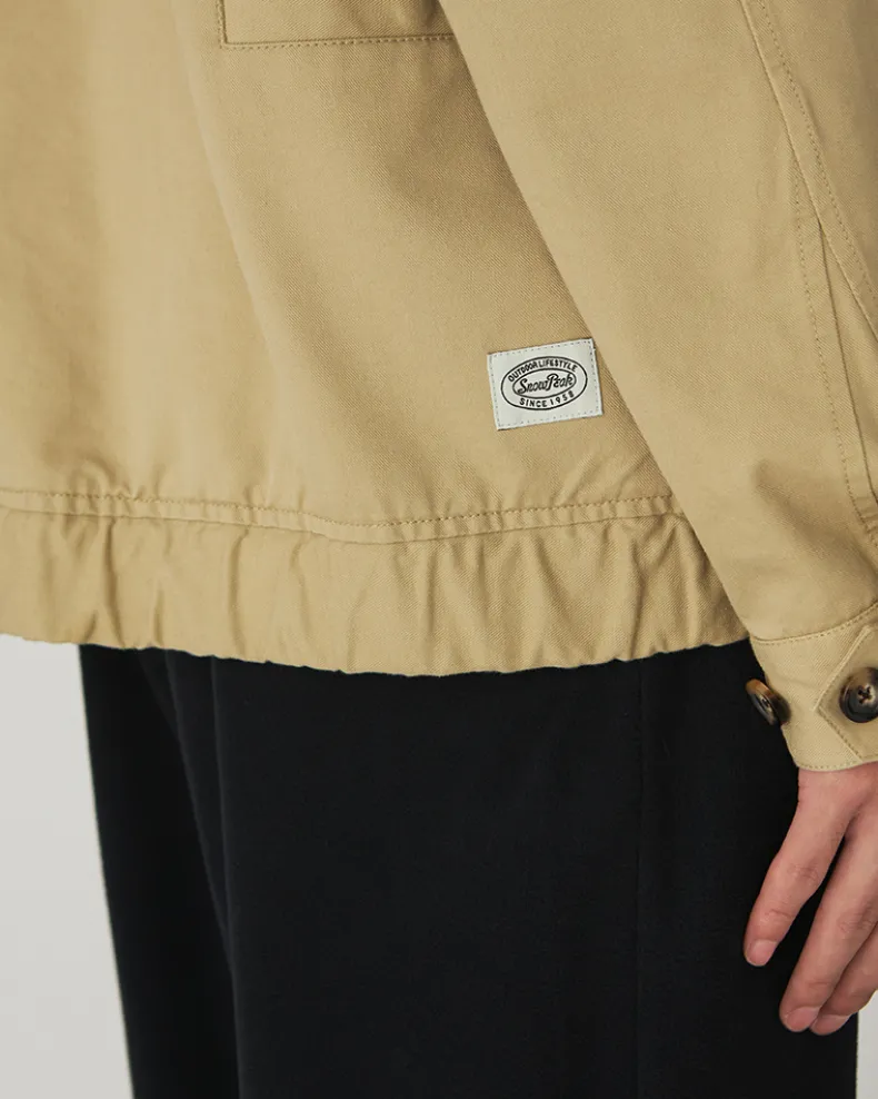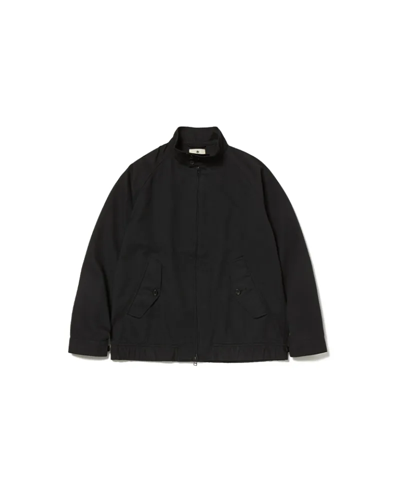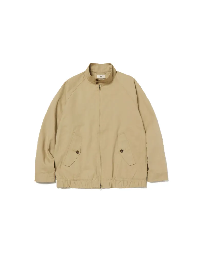 The Takibi Chino Jacket is a fire-resistant stand collar jacket. The jacket features a double button closure at the collar, a double zippered front, and angled flap pockets at the waist. Additional features include a shirred elastic hem, buttoned cuff, slit pocket, and stitched label on the back right.