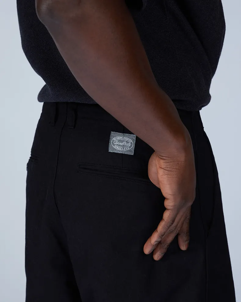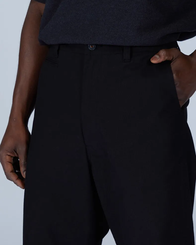 The Takibi Chino Pants are designed to fit loose in the leg, with the hem hitting below the ankle. We recommend taking your normal size for a standard fit. The model stands 6′ and wears size L.