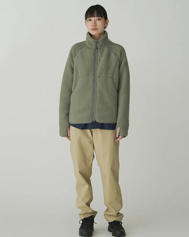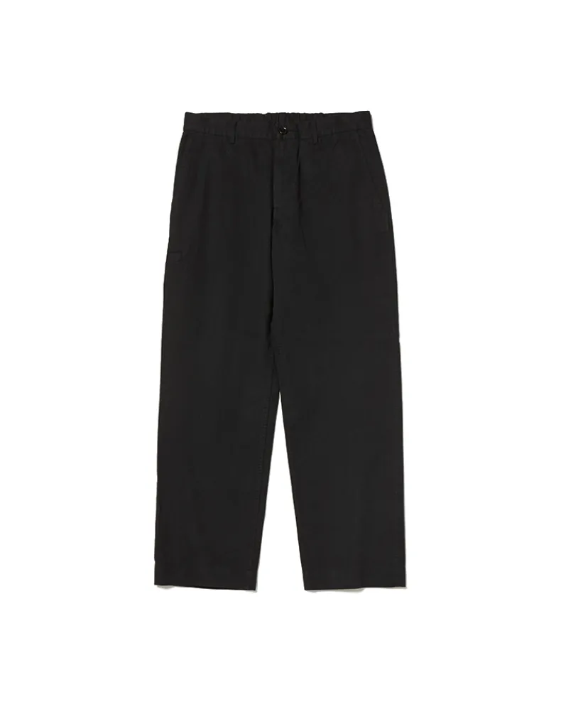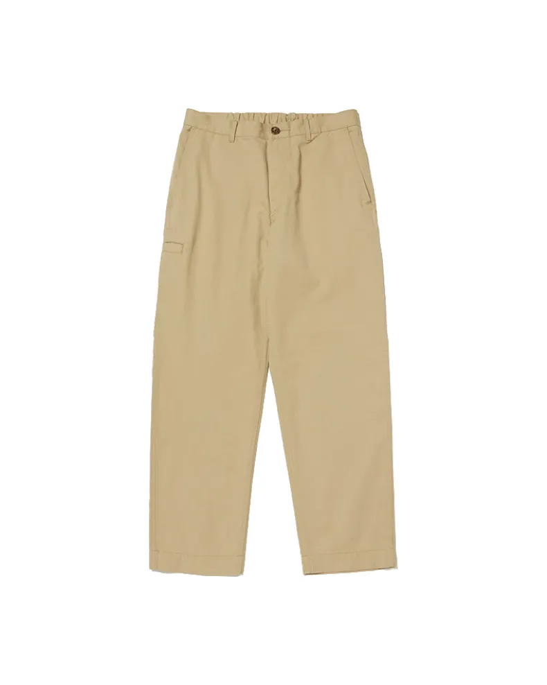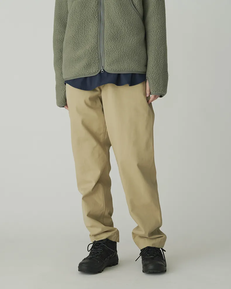 The Takibi Chino Pants are fire-resistant casual work pants. The pants feature two angled pockets at the waist, two slit pockets at the back, and one on the right thigh. Additional features include a button and zipper at the front, elastic shirring at the waist on the back, and belt loops for a customizable fit.