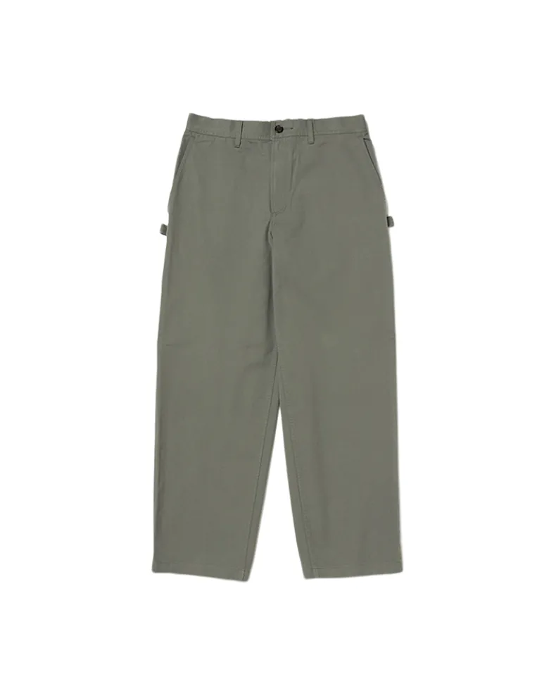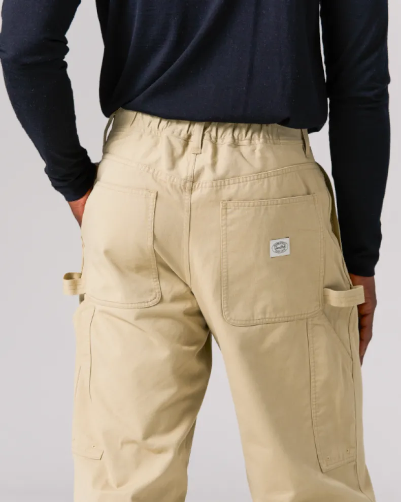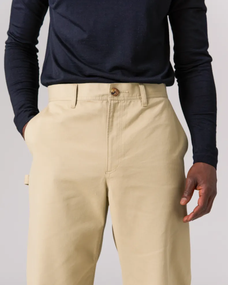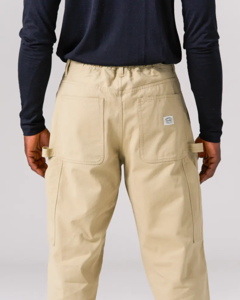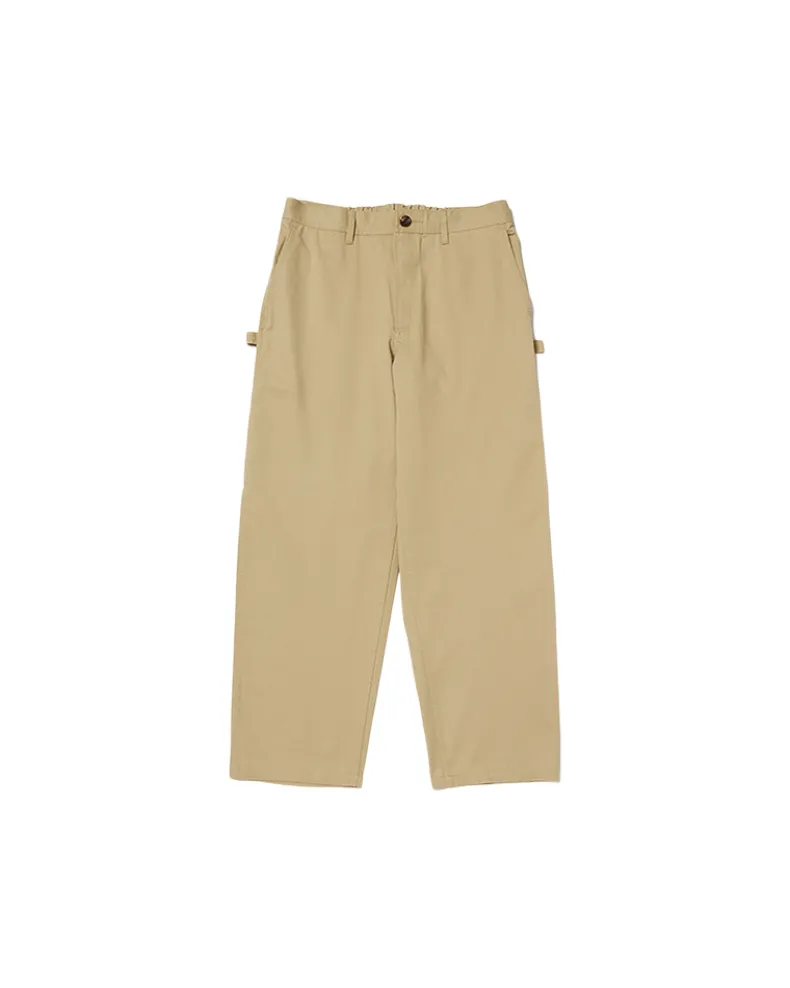 The Takibi Chino Wide Pant is a fire-resistant carpenter-style pant. The pants feature two angled pockets at the waist, and two patch pockets on the back, with tool loops and vented tool pockets on either side. Additional features include a button and zipper closure at the front, elastic shirring at the back, belt loops, and a stitched logo patch on the back right pocket.