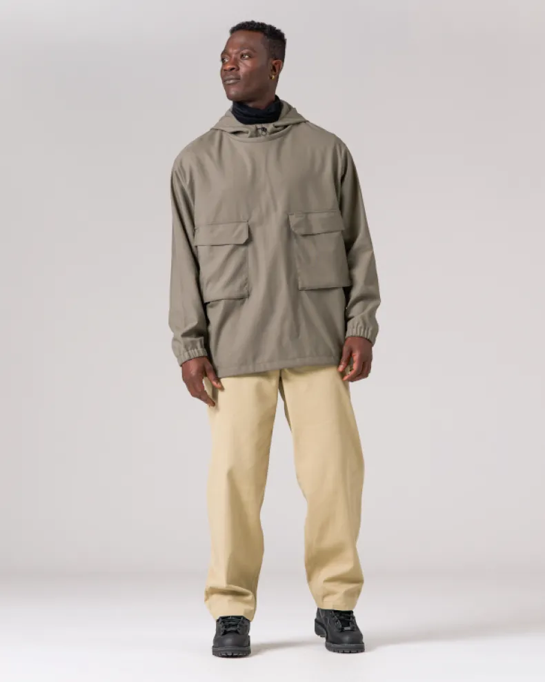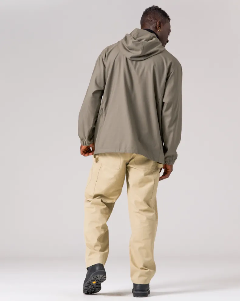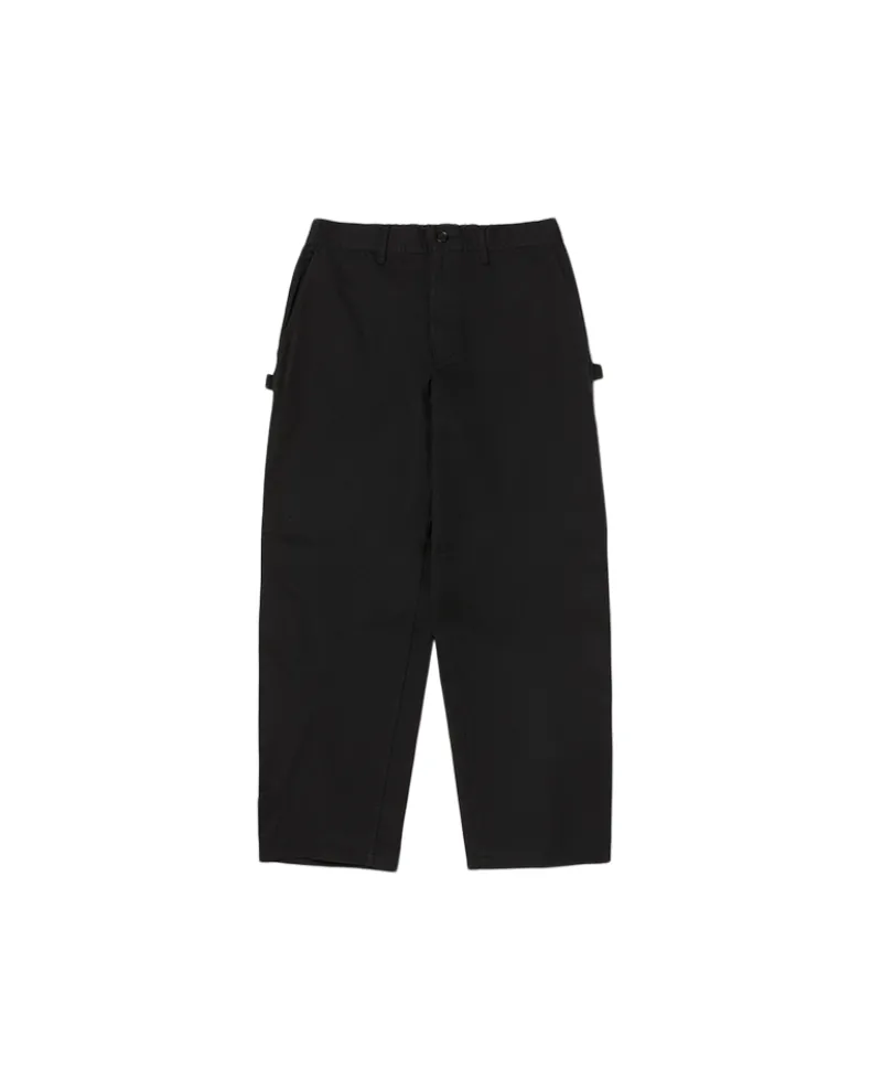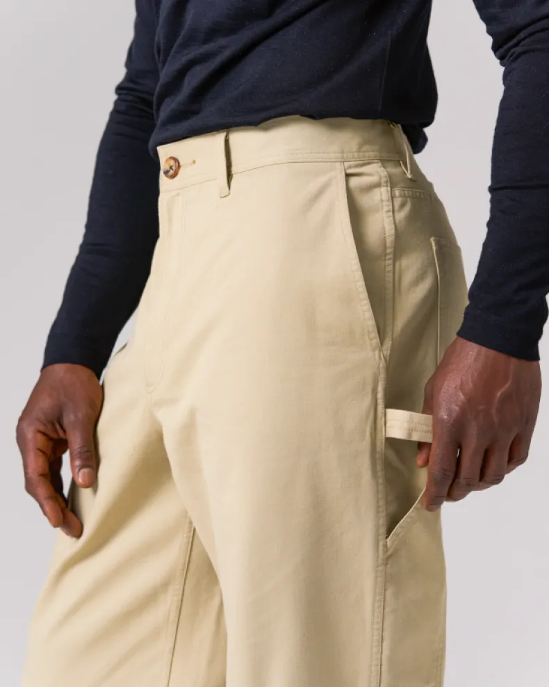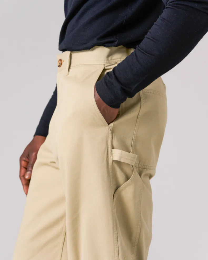 The Takibi Chino Wide Pant is a fire-resistant carpenter-style pant. The pants feature two angled pockets at the waist, and two patch pockets on the back, with tool loops and vented tool pockets on either side. Additional features include a button and zipper closure at the front, elastic shirring at the back, belt loops, and a stitched logo patch on the back right pocket.